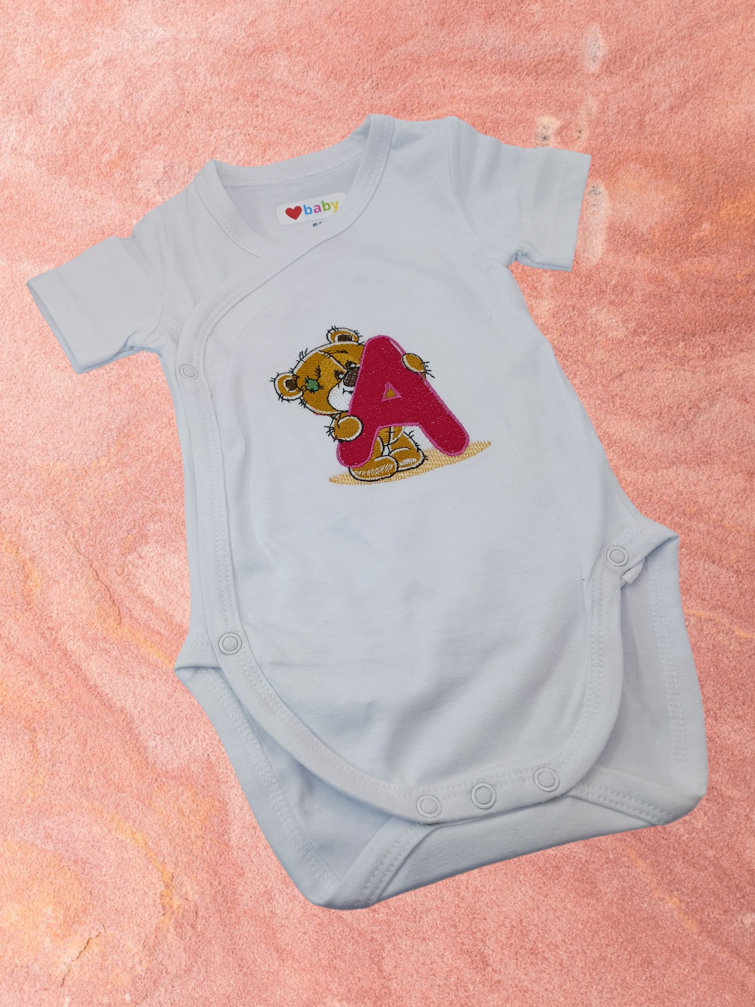 kwaliteitsvol rompertje met een schattige geborduurde afbeelding met de eerste letter naam baby naar keuze !