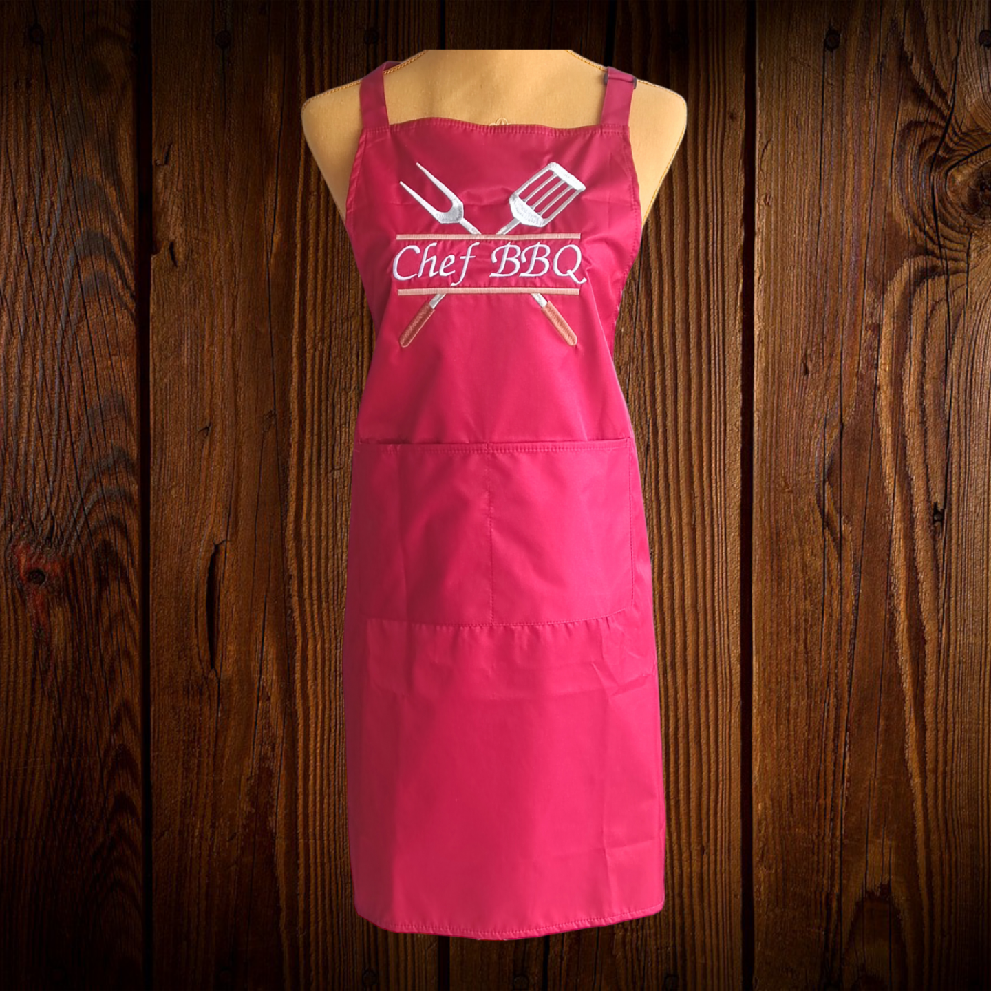 tekst op de schort in de afbeelding is standaard "chef BBQ", maar kan desgewenst vervangen worden door Uw eigen naam of tekst