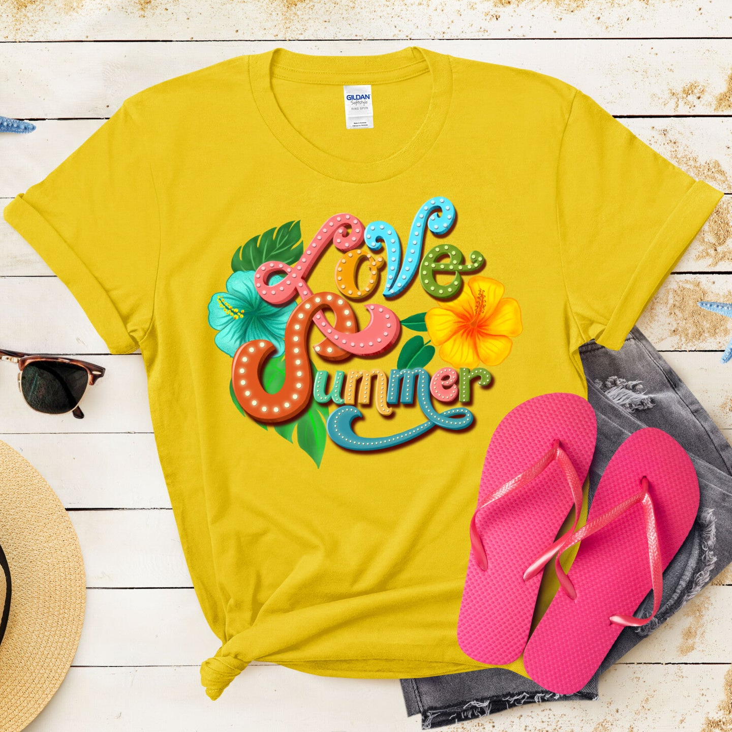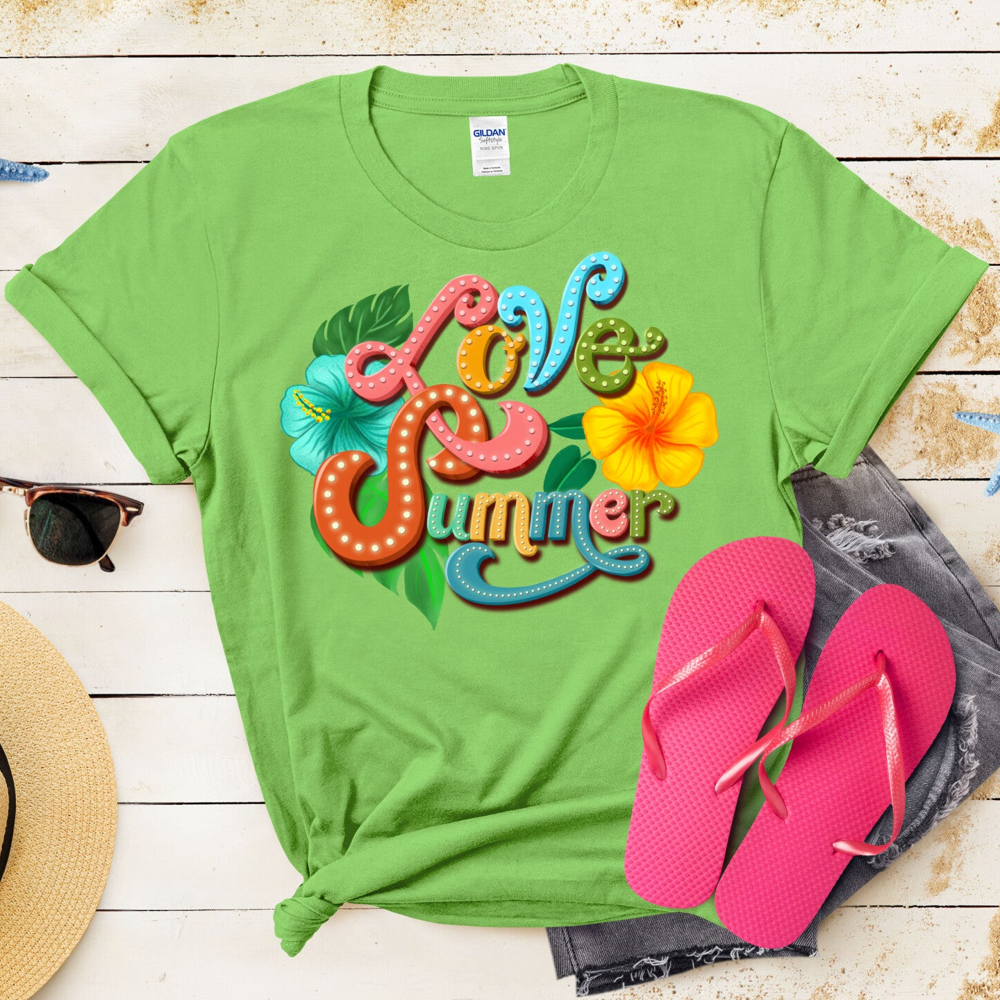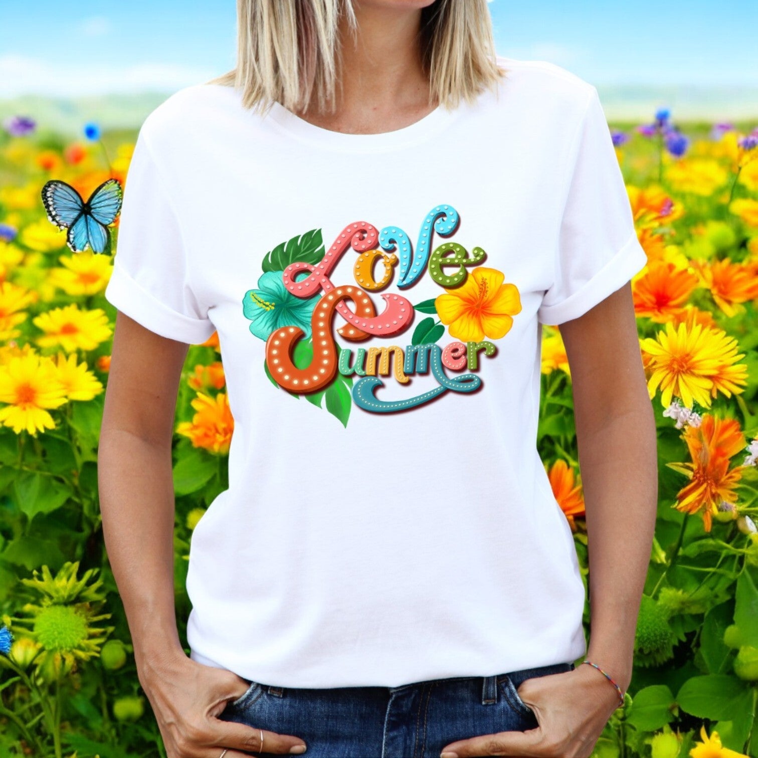 Voel de zon op je huid en de vrijheid van lange zomerdagen met dit frisse dames T-shirt met een sprankelende zomerprint. Het ontwerp – denk aan tropische bloemen, zonsondergangen, palmbomen of speelse pasteltinten – straalt warmte, lichtheid en positiviteit uit. Een echte eyecatcher die moeiteloos je zomeroutfit compleet maakt.