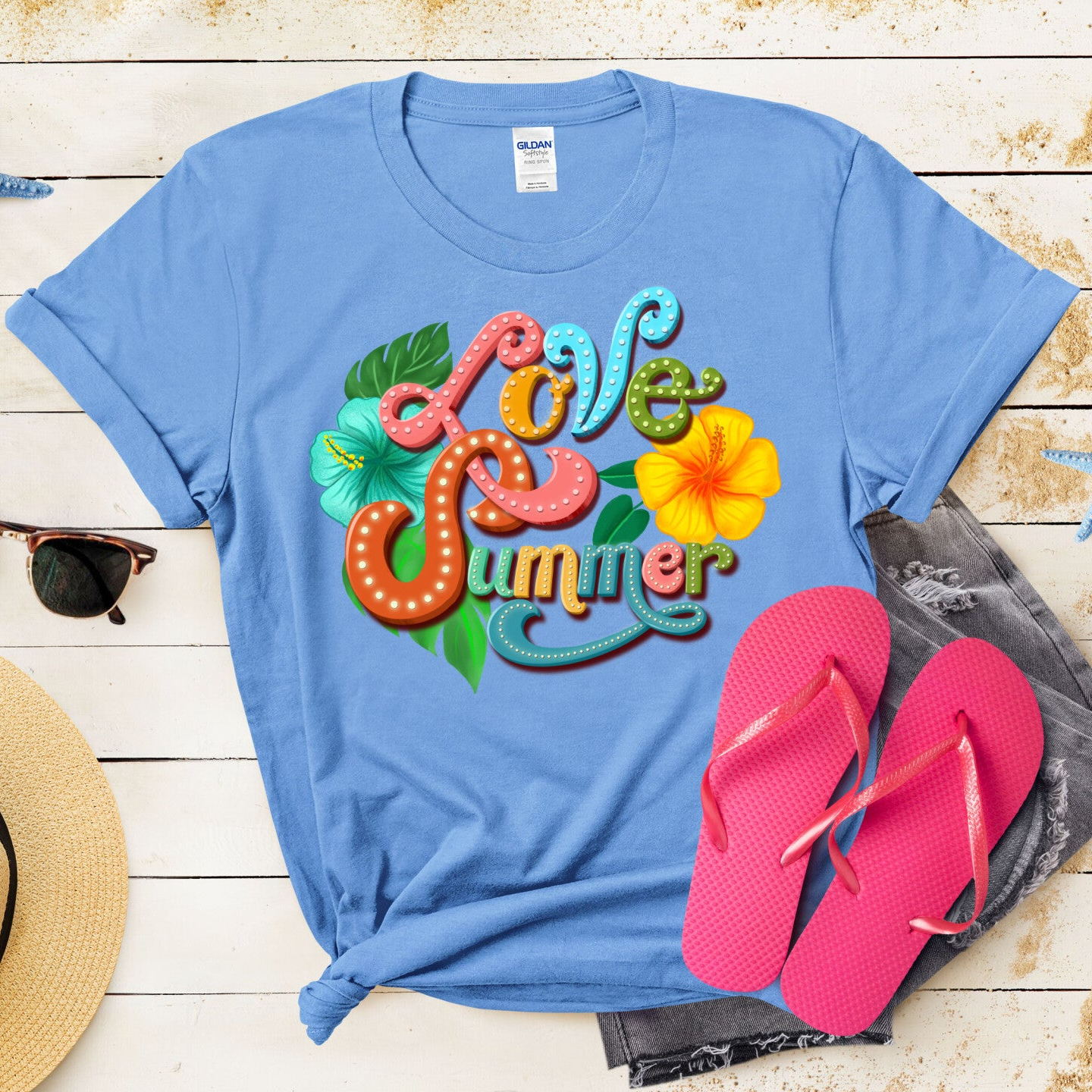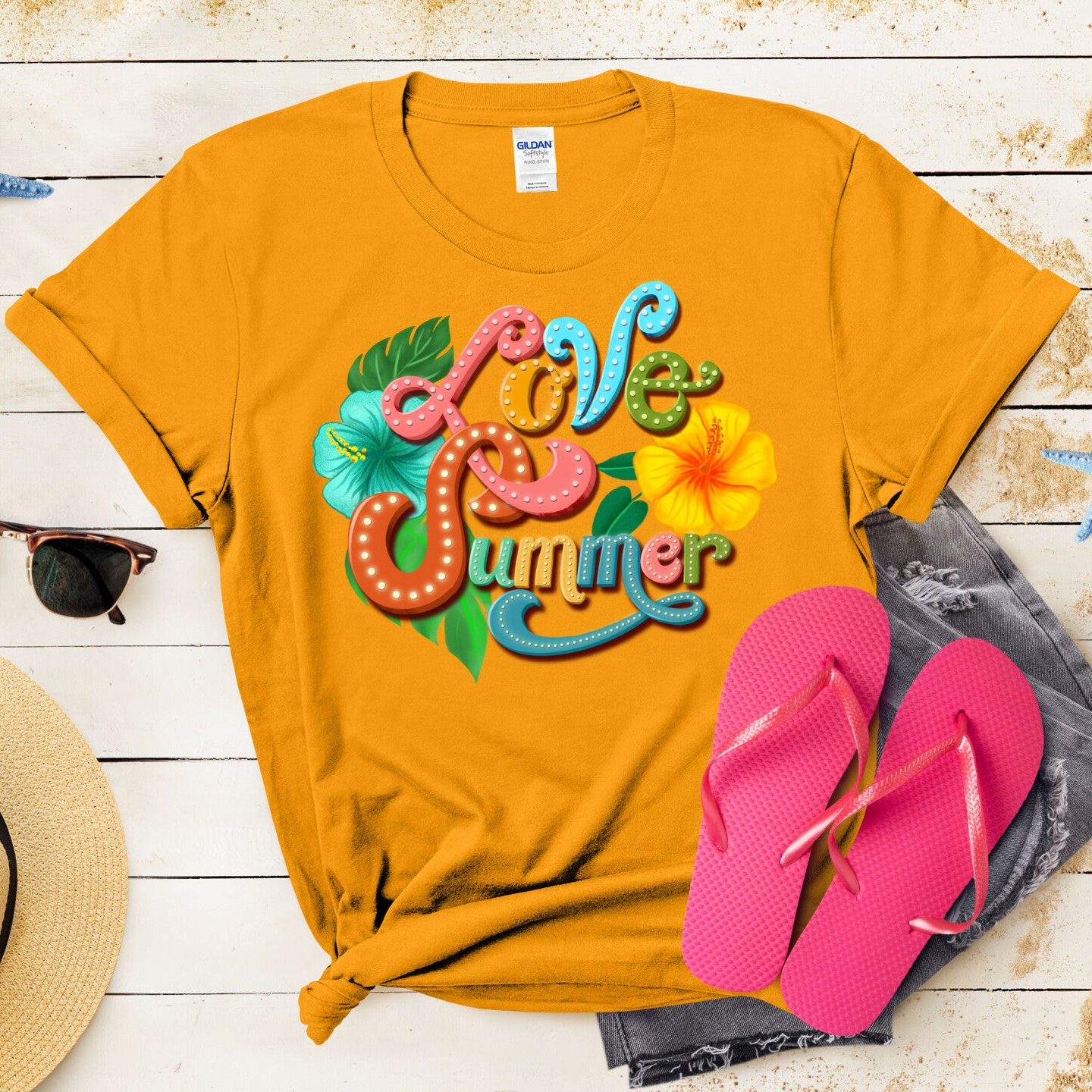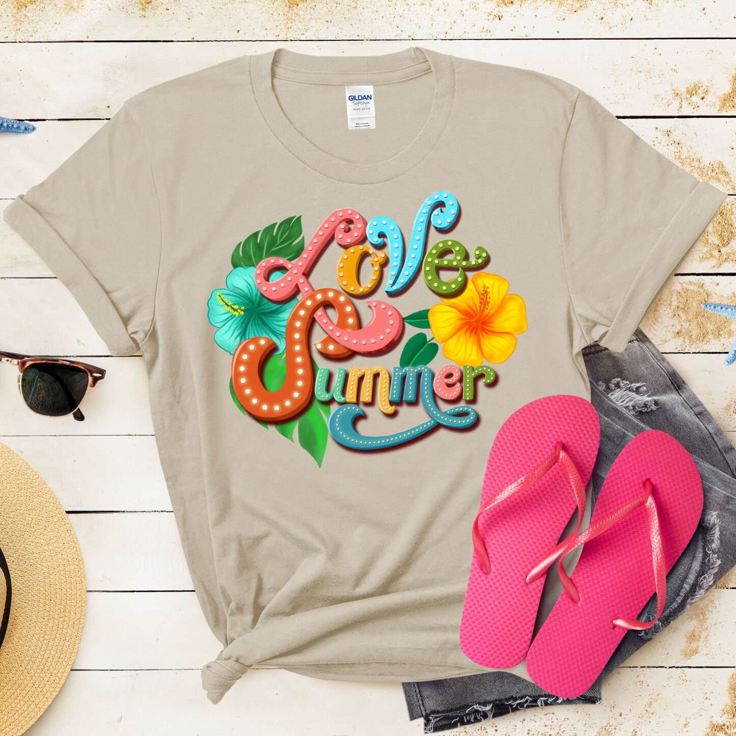 Voel de zon op je huid en de vrijheid van lange zomerdagen met dit frisse dames T-shirt met een sprankelende zomerprint. Het ontwerp – denk aan tropische bloemen, zonsondergangen, palmbomen of speelse pasteltinten – straalt warmte, lichtheid en positiviteit uit. Een echte eyecatcher die moeiteloos je zomeroutfit compleet maakt.