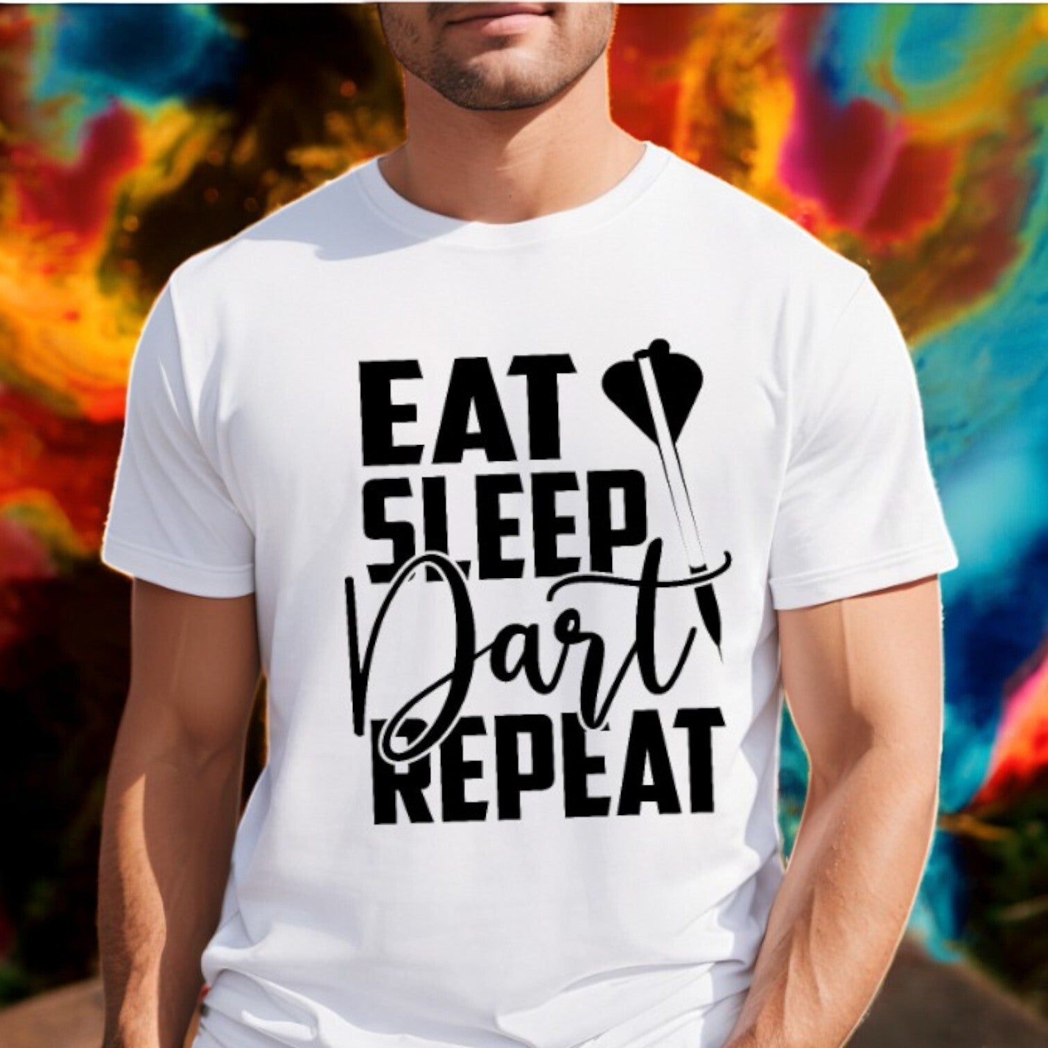 Voor de echte dartfanaten die het pijltjes gooien niet zomaar een hobby noemen: dit mannelijke witte T-shirt met de opvallende print “Eat. Sleep. Darts. Repeat.” is een eerbetoon aan de populaire sport die verslavend ontspannend werkt. Of het nu gaat om een spontane wedstrijd met vrienden of serieuze training richting de bullseye, dit shirt zegt precies wat jij voelt: darts is geen spelletje, het is een levensstijl.