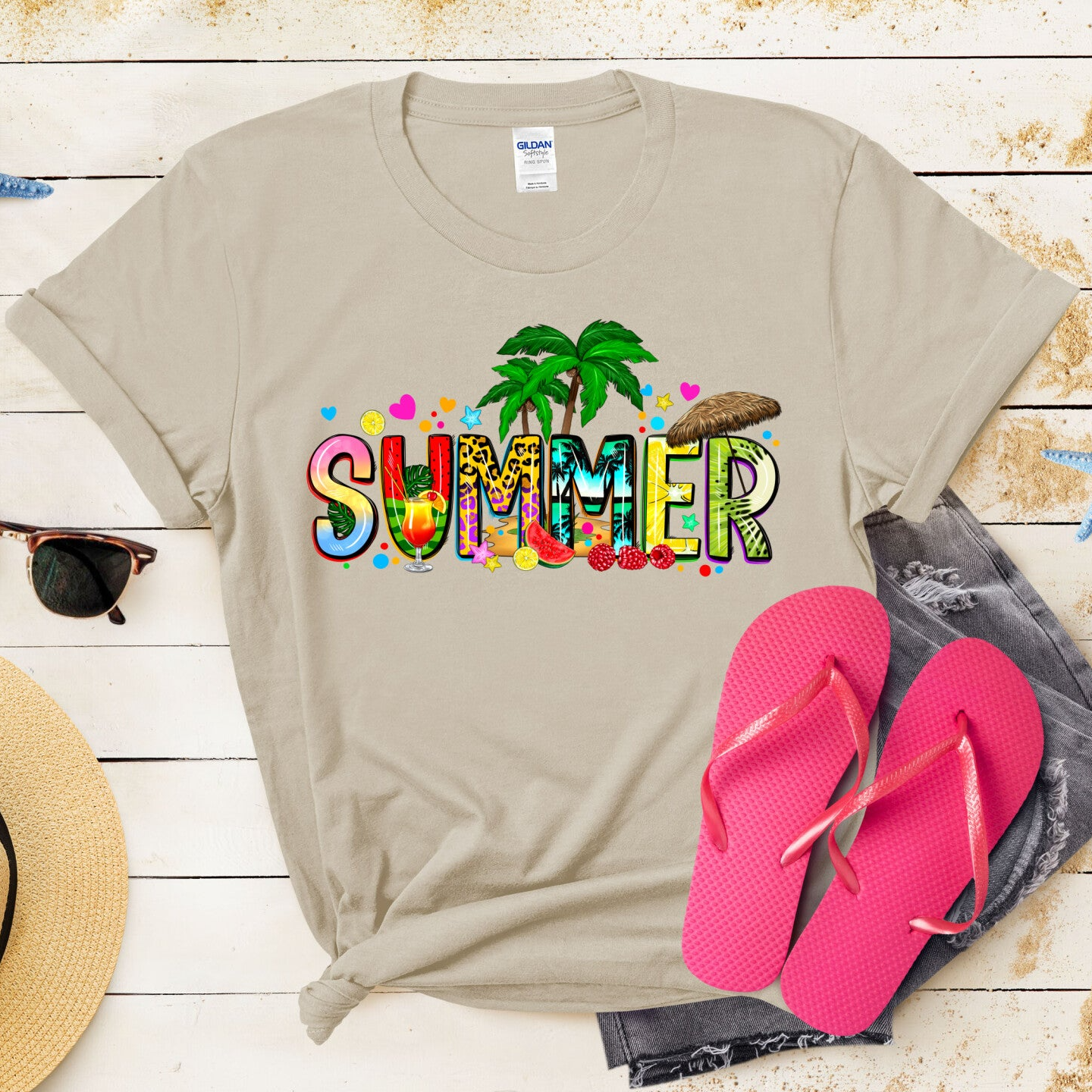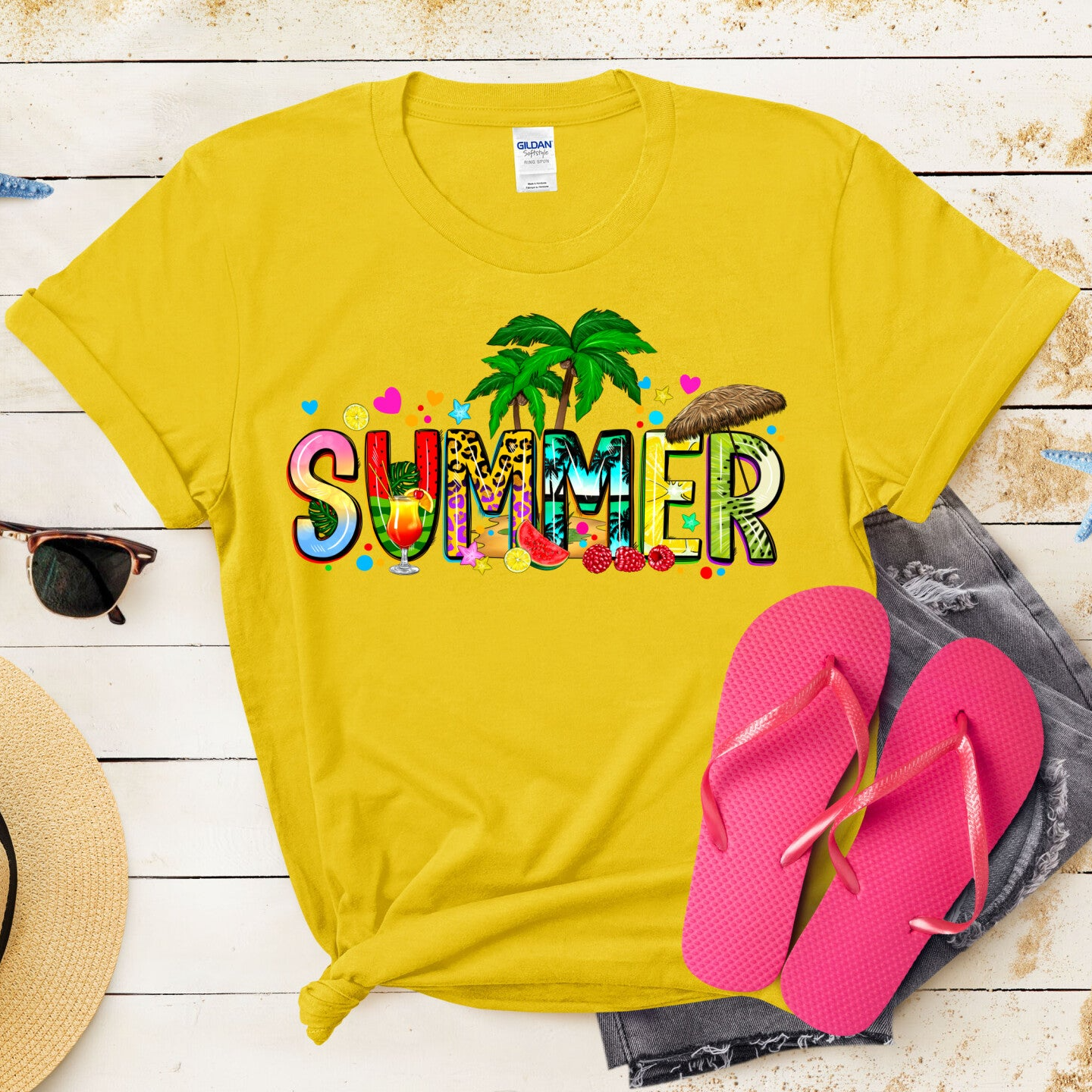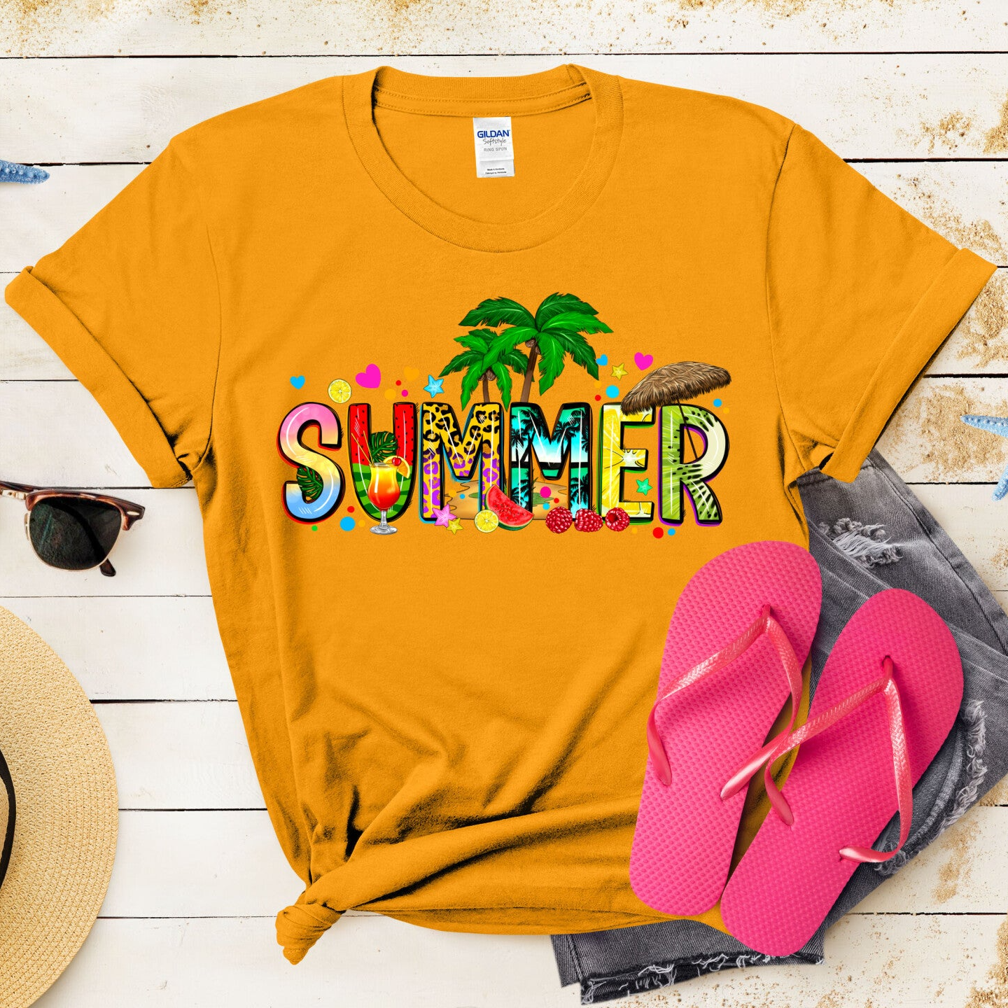 Voel de zon op je huid en de vrijheid van lange zomerdagen met dit frisse dames T-shirt met een sprankelende zomerprint. Het ontwerp – denk aan tropische bloemen, zonsondergangen, palmbomen of speelse pasteltinten – straalt warmte, lichtheid en positiviteit uit. Een echte eyecatcher die moeiteloos je zomeroutfit compleet maakt.