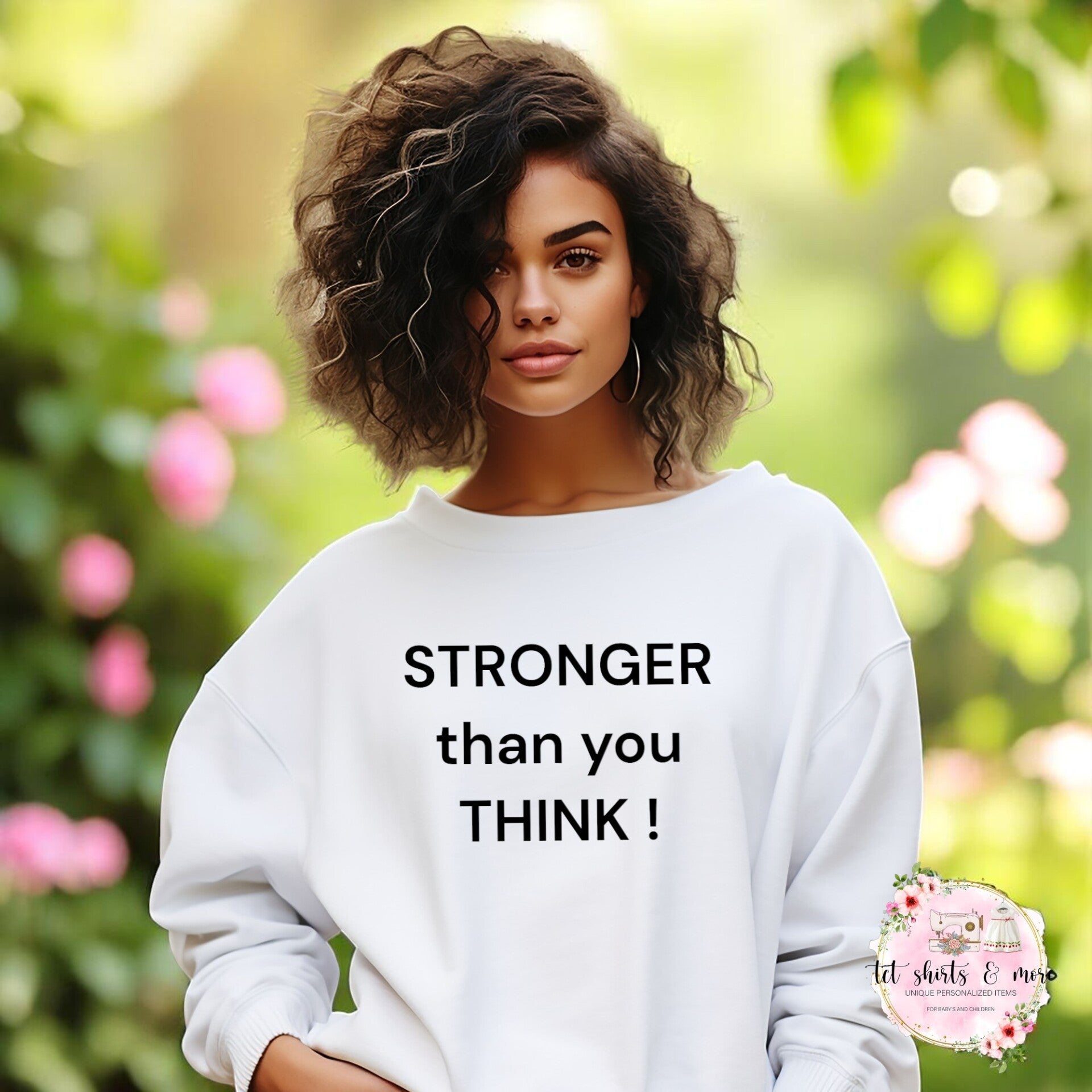 Deze stijlvolle dames sweater is perfect voor elke dag en straalt kracht uit met de geborduurde tekst "STRONGER than you THINK!". Gemaakt van comfortabele materialen, biedt deze sweater een fijne pasvorm en een trendy uitstraling. Verkrijgbaar in diverse kleuren, zoals te zien op de foto's, zodat je altijd een kleur kunt kiezen die bij jouw stijl past. Of je nu een casual look wilt creëren of je outfit wilt opvrolijken, deze sweater is een geweldige keuze!