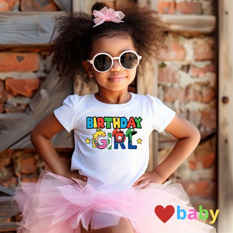 Laat je kleine jarige stralen in stijl met dit vrolijke "BIRTHDAY GIRL" t-shirt, speciaal ontworpen in een kleurrijke Mario Bros-geïnspireerde opdruk! Een perfecte keuze voor fans van het iconische spel en ideaal voor een feestelijke dag vol avontuur.